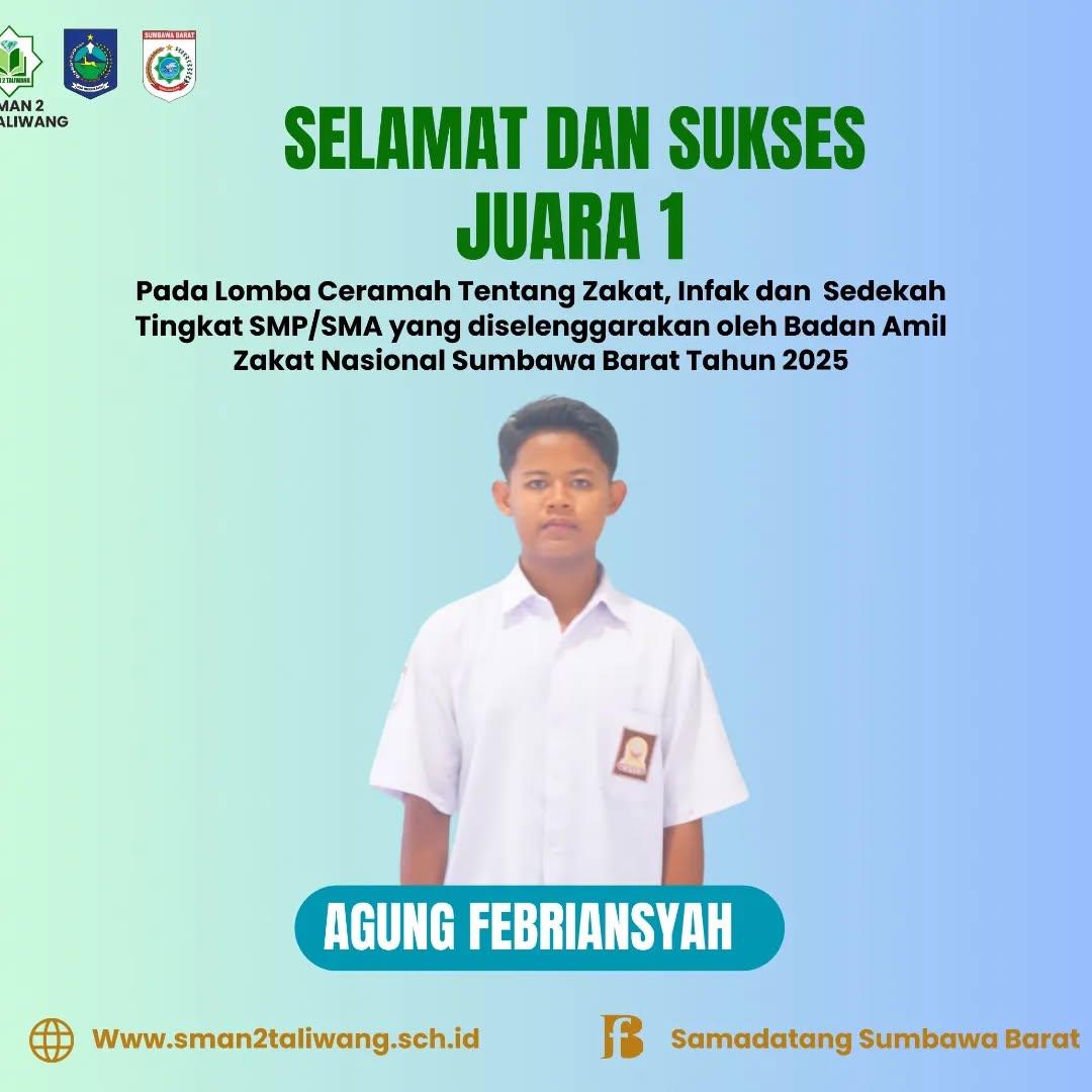 Selamat dan Sukses Selalu siswa SMAN 2 Taliwang ananda Agung Febriansyah Meraih Juara 1 dalam Lomba Ceramah Tentang Zakat, Infak dan Sedekah tingkat SMA yang diselenggrakan oleh BAZNAS Kab. Sumbawa Barat Tahun 2025 yang dilaksanakan pada tanggal 21 Februari 2025.