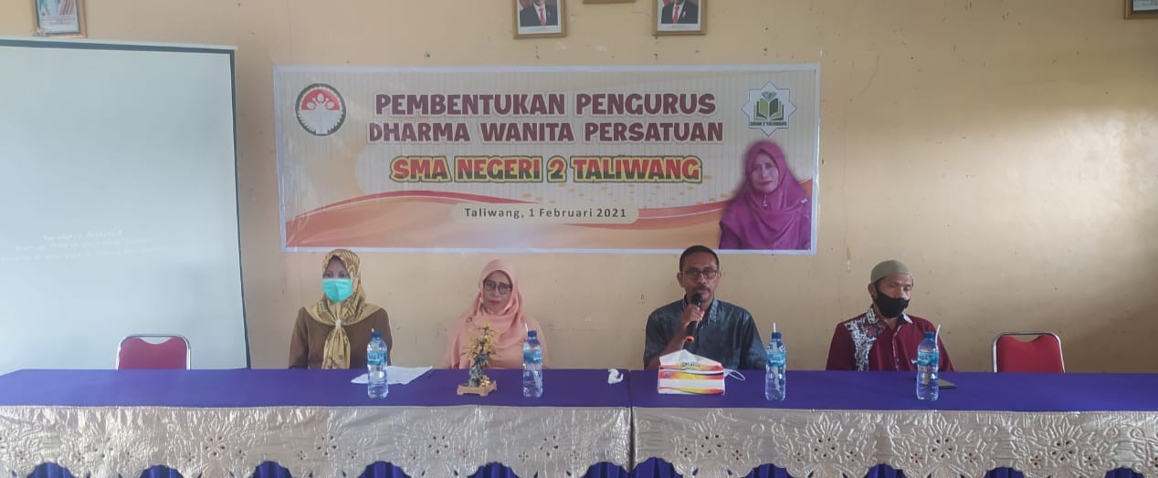 Taliwang, 1 Februari 2021, Rapat Pembentukan Pengurus Baru Dharma Wanita SMA Negeri 2 Taliwang Kabupaten Sumbawa Barat Provinsi Nusa Tenggara Barat telah diselenggarakan, rapat yang berlangsung di Aula SMAN 2 Taliwang di buka oleh Bapak Kepala SMA Negeri 2 Taliwang. Dalam sambutannya mengungkapkan akan selalu mensupport segala kegiatan dan program yang dibentuk oleh Dharma Wanita SMAN 2 Taliwang.